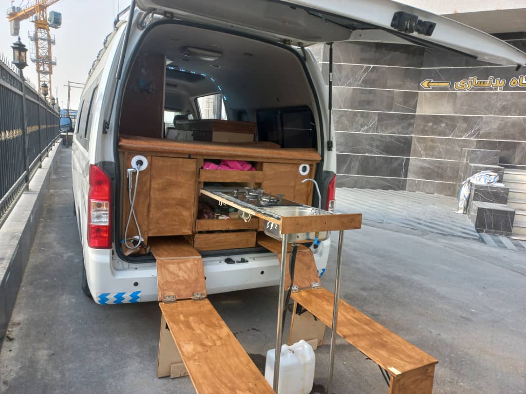 ۲. بخش آشپزخانه کوچک: مجهز به یخچال قابل اتصال به برق و باتری خودرو، گاز مسافرتی، سینک کوچک، و کابینتهای ذخیرهسازی.